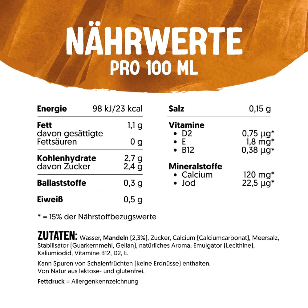 Alpro Mandeldrink Ohne Zucker est une boisson aux amandes à base de plantes pour ceux qui souhaitent une option sans sucre, sans produits laitiers ni gluten, tout en conservant un goût riche et crémeux. Enrichi en calcium et en vitamines essentielles, il convient à toute la famille, dans l'alimentation quotidienne ou comme alternative au lait dans le café, les céréales ou le thé.