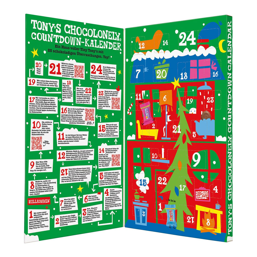 Le calendrier de l'Avent Tony's Chocolonely apporte la magie de Noël dans une expérience douce, parfaite comme cadeau pour les amateurs de chocolat belge équitable et les végétariens. 24 bonbons Tiny Tony's, chacun caché dans une porte, créent un compte à rebours plein de surprises et une histoire sur notre engagement à mettre fin à l'exploitation du cacao.