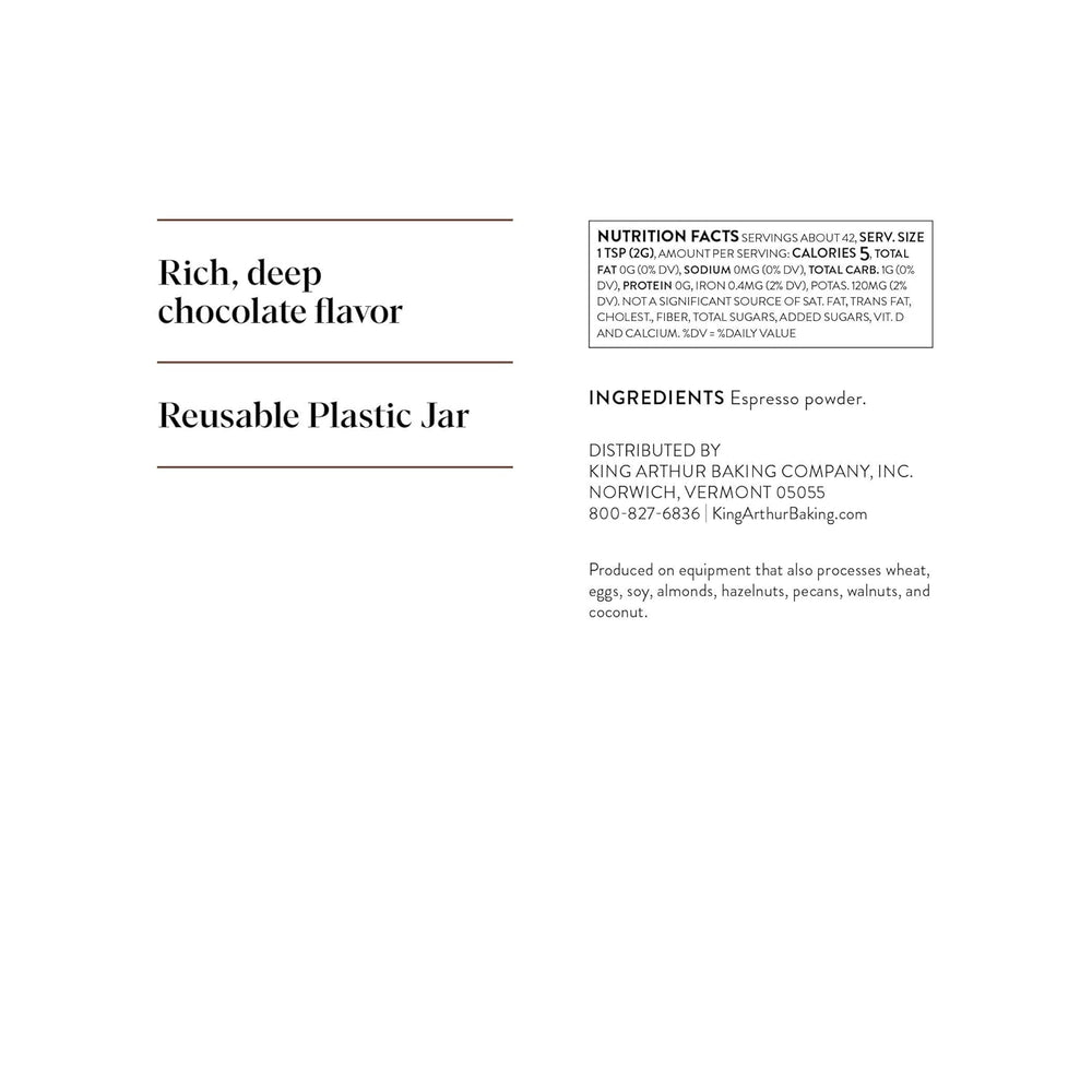 Ajoutez une nouvelle profondeur à votre goût de chocolat avec la poudre d'espresso de King Arthur Baking Company, une poudre de café finement moulue conditionnée dans un contenant de 3 oz (85 g). Parfait pour les cuisiniers passionnés et ceux qui souhaitent une saveur plus complexe dans les gâteaux et desserts au chocolat.